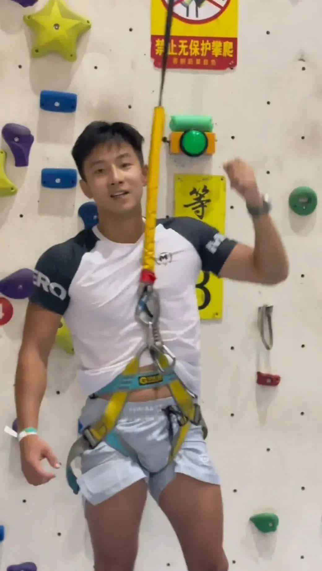 他在岩壁上舞动,肌肉在运动中线条分明,展现出攀岩者特有的风采