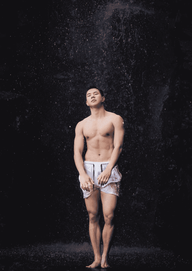 白皙干净的皮肤,唇红齿白的长相,更给人一种青春活力的感觉。特别是当他的肌肉被暴布的水流打湿后,那种晶莹的质感,张力直接拉满。