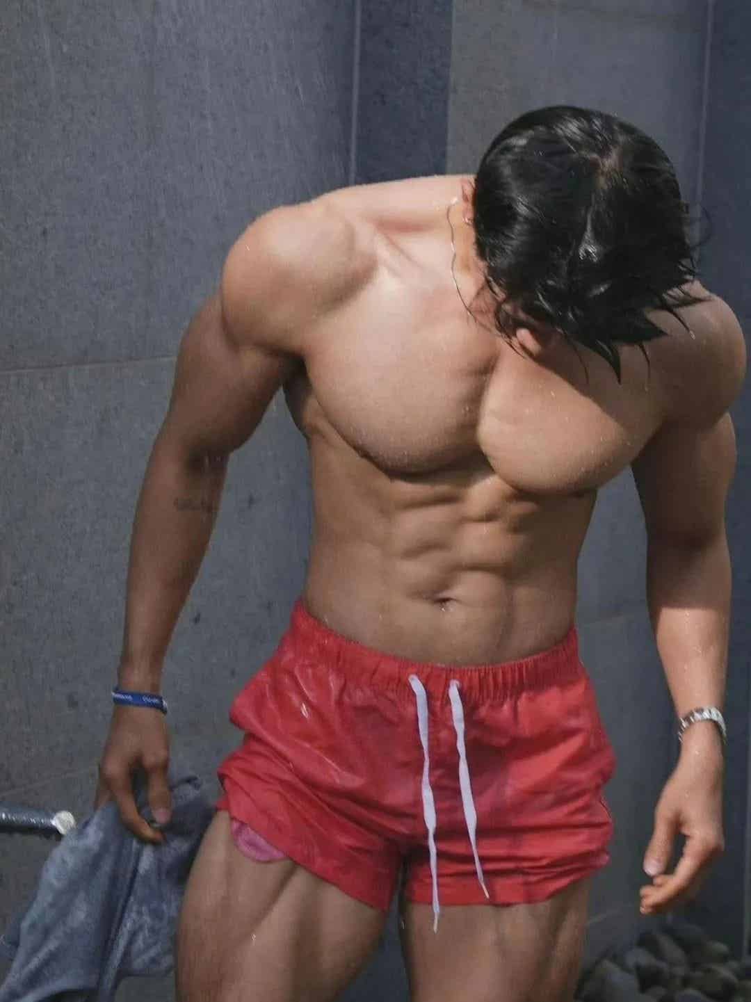 他只穿着一条鲜艳的红色小短裤,壮实的肌肉在水珠的映衬下显得更加分明