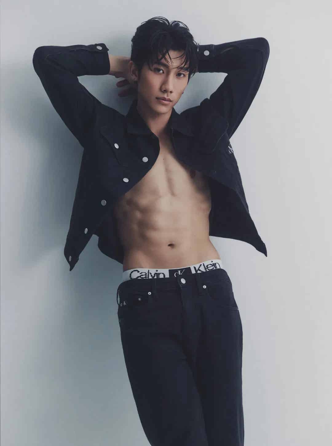 作为模特出身的陈柏文,其身材管理之严格可见一斑。无论是穿着 CK 的极简黑夹克,还是其他任何风格的服饰,他都能轻松驾驭,仿佛每一件衣物都是为他量身定制。