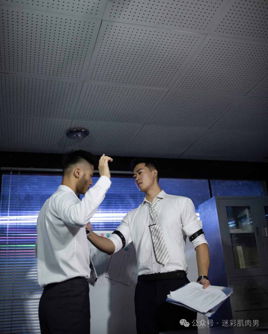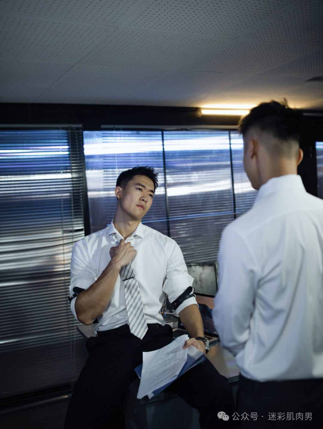 首先,让我们来谈谈这组照片的整体氛围。办公室的背景为整个场景增添了一份专业和严肃的气息,而模特们的西装着装则突显出他们的精致和自信。这种氛围的营造使得照片不仅仅是关于外貌的展示,更传递出一种成功和自信的形象。