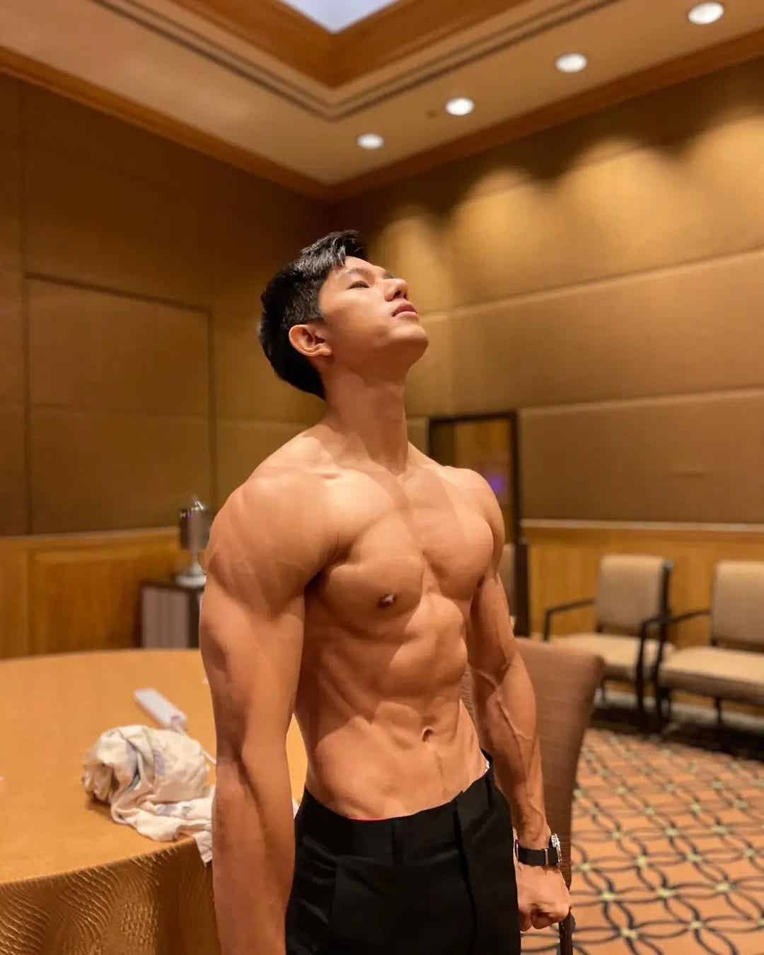 他的魅力远不止于比赛结果。他是曼谷大学体育系 PR 专业的毕业生,大学期间就兼职当起了健身教练。从那时起,他就凭借宽肩窄腰、六块腹肌和雕刻般的肌肉线条,成为众多学妹学弟的“健身启蒙老师”。
