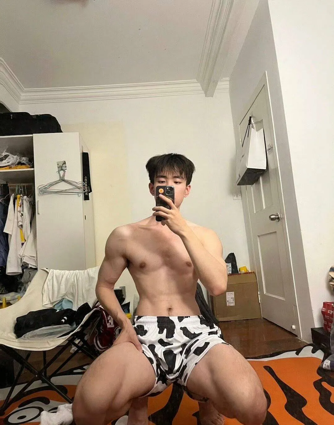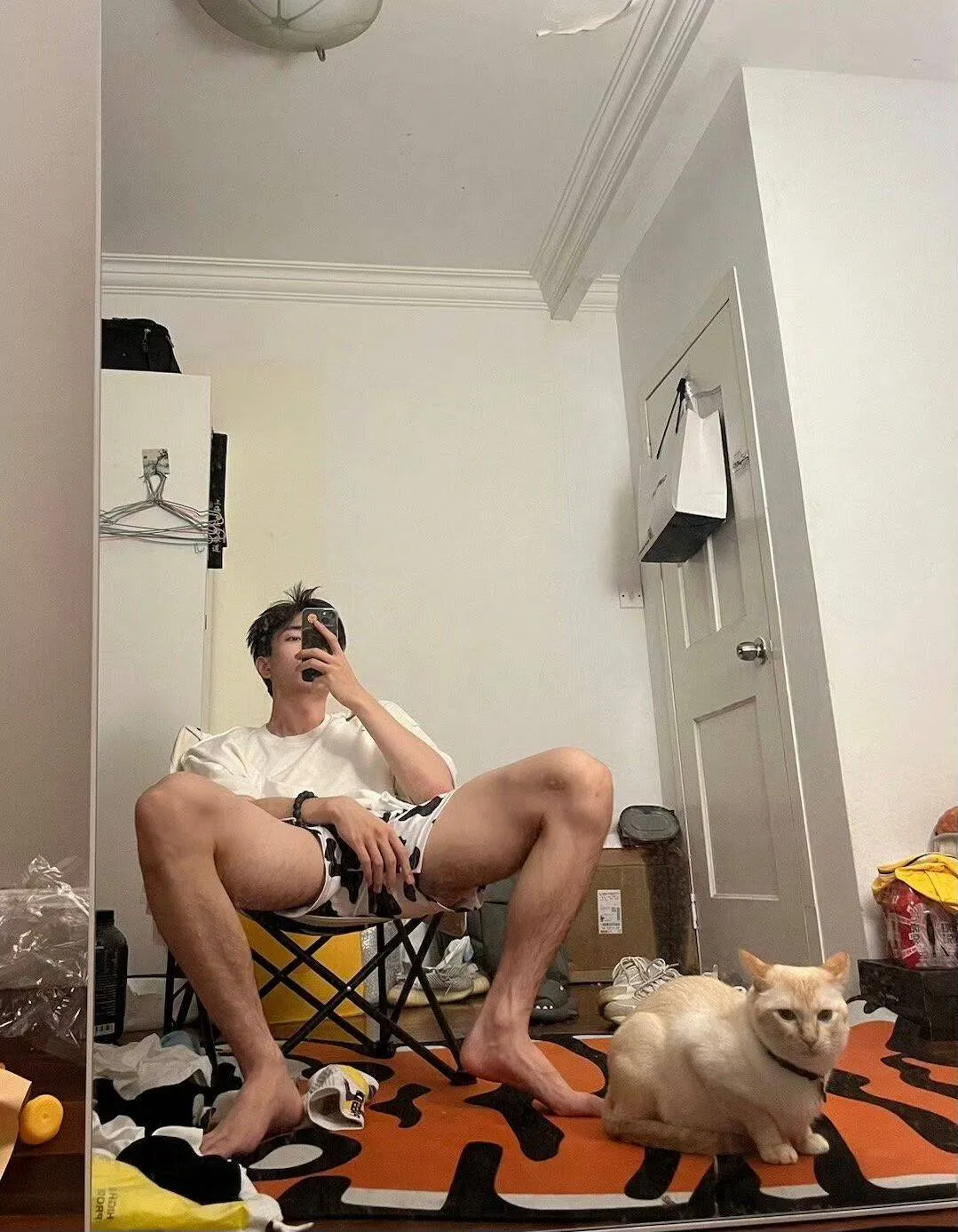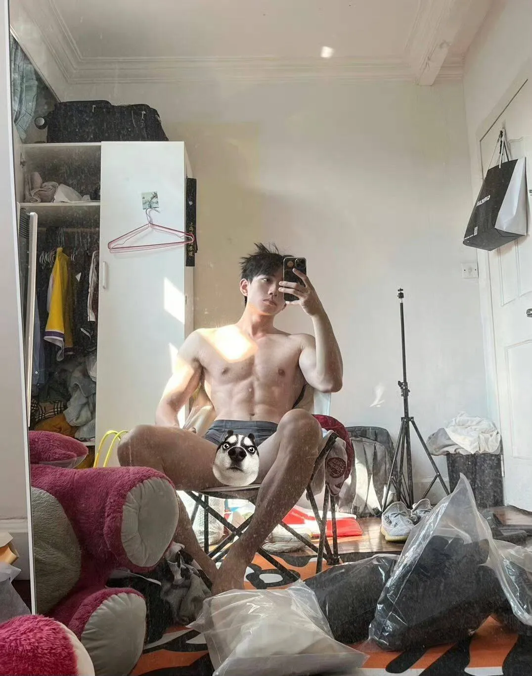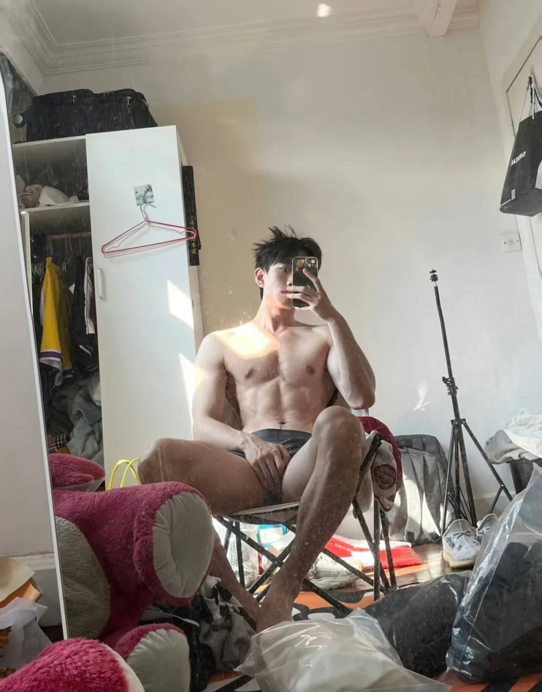 只要稍微用力一收腹, 那复合着青春气息的体格就会立马展现出凹凸有致、性感至极的腹肌线条。我真希望自己就是小哥身边那只幸运的小猫猫,整日能贴着他结实火辣的肌理打盹啊!