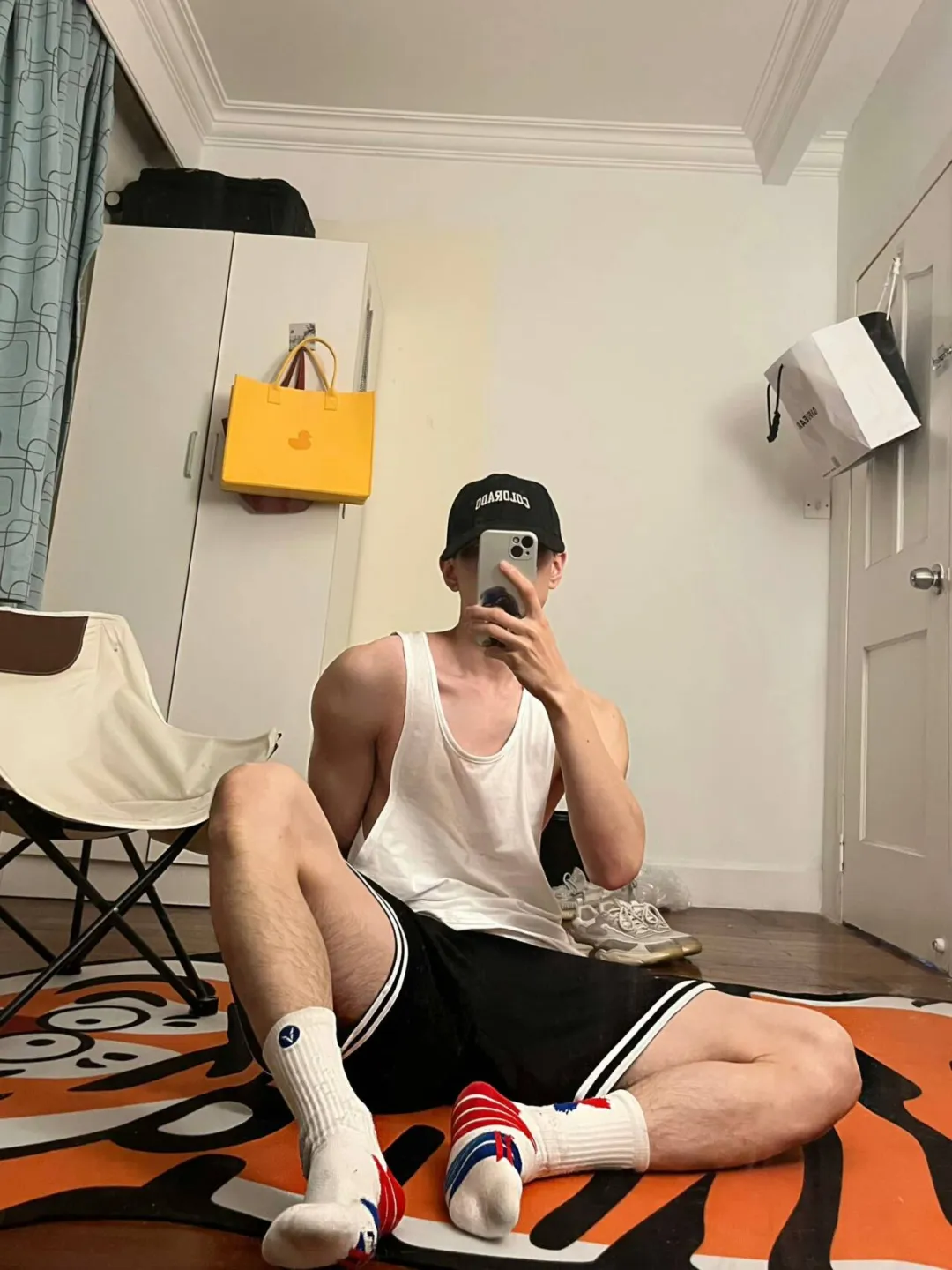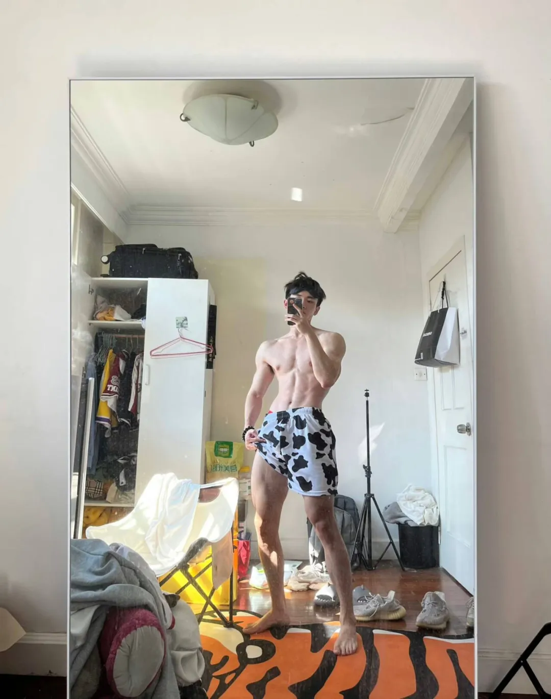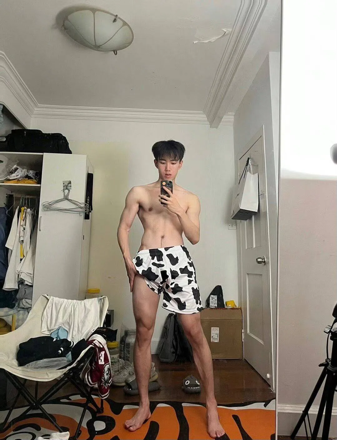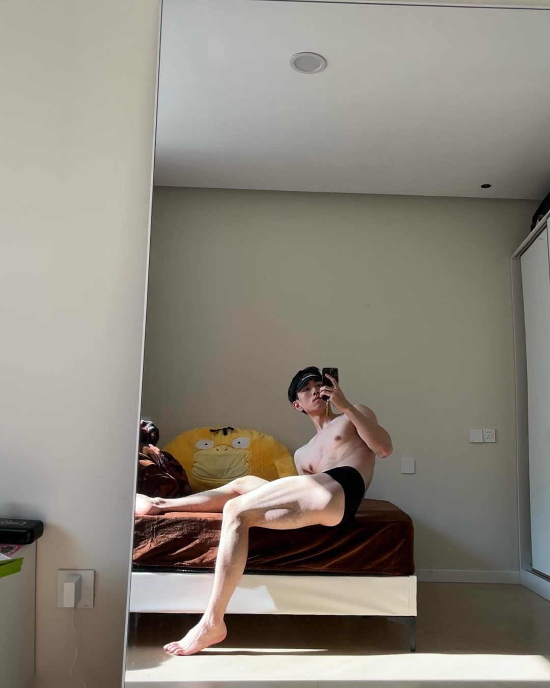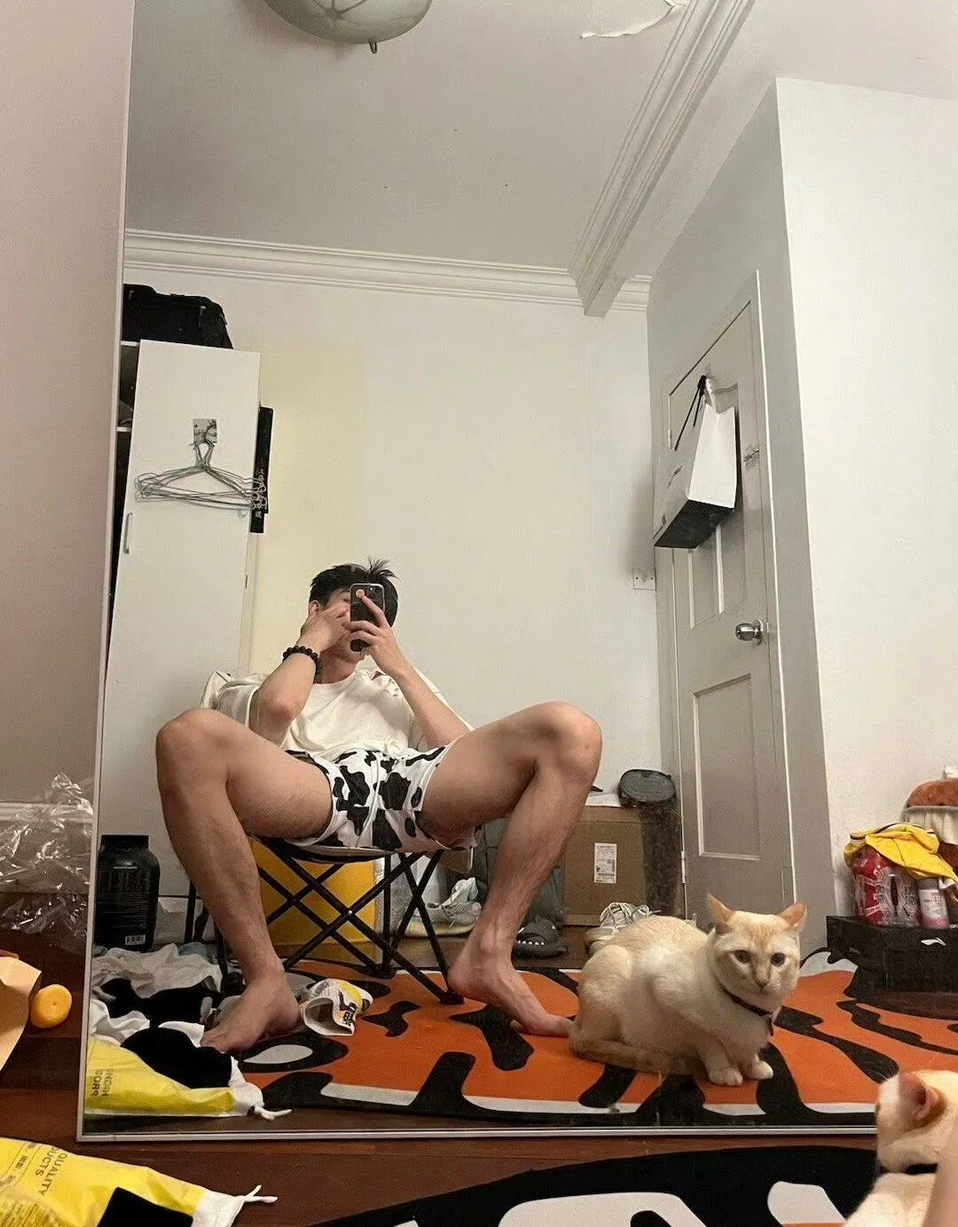 只要稍微用力一收腹, 那复合着青春气息的体格就会立马展现出凹凸有致、性感至极的腹肌线条。我真希望自己就是小哥身边那只幸运的小猫猫,整日能贴着他结实火辣的肌理打盹啊!