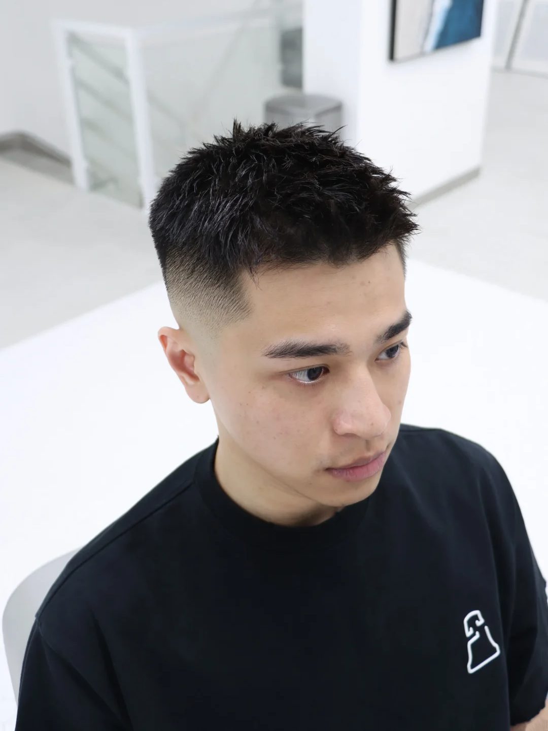 短碎发也是男生发型中比较常见的一款减龄造型,而且造型样式也是多种多样,比如上面这款上扬短碎发就是其中一种。把两边的头发全部剃光,中间的头发适当留长,刘海位置的头发修剪出些碎碎的效果,在打理造型的时候简单将刘海的头发向上吹起,整体造型看起来不仅轻盈舒适,而且还特别阳光帅气!