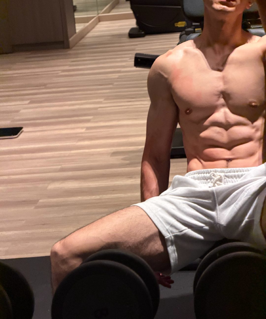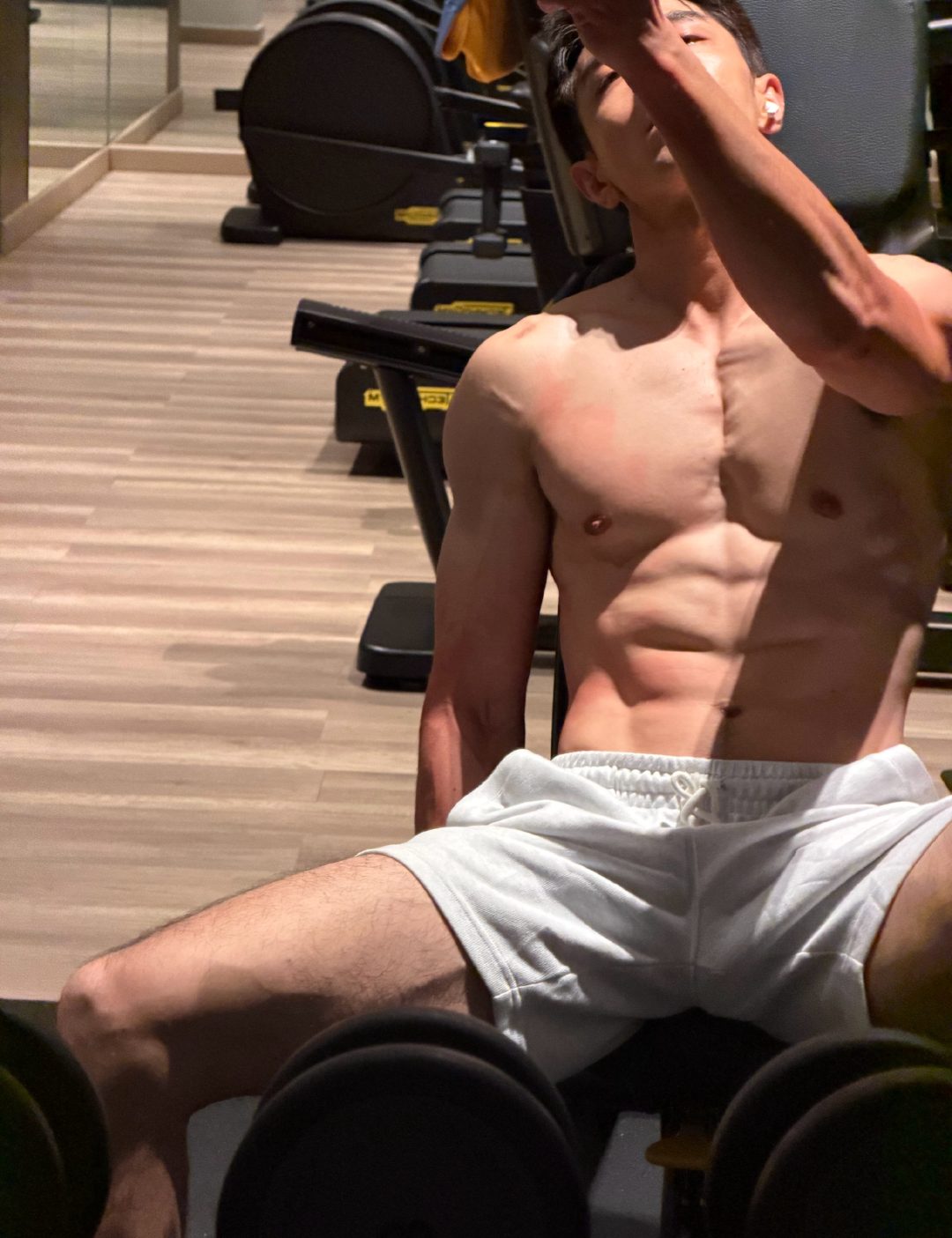 从全身照再到腹肌近照,虽说没有全方位展示自己的健身成果,但从其成型的腹肌和胸肌便不难看出,金瀚为此付出的汗水和努力。