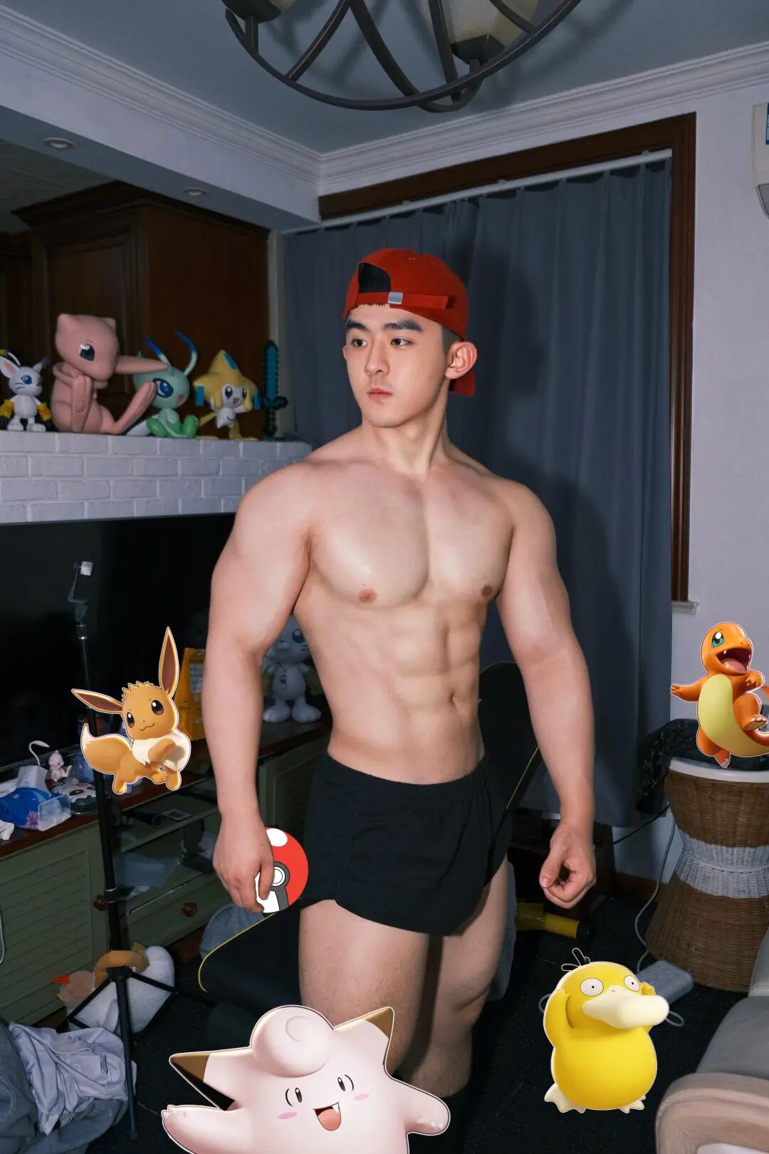 这种“可爱”并非单纯的幼态,而是一种温润如玉的气质。无论是在宝可梦公仔环绕下的生活照,还是戴着萌系兽耳的趣味穿搭,他都展现出一种极高的时尚包容度。这种天生的亲和力,让他在硬核的健身圈里显得格外温柔,仿佛他不是在冰冷的器械中苦练,而是在雕刻一件充满活力的艺术品。