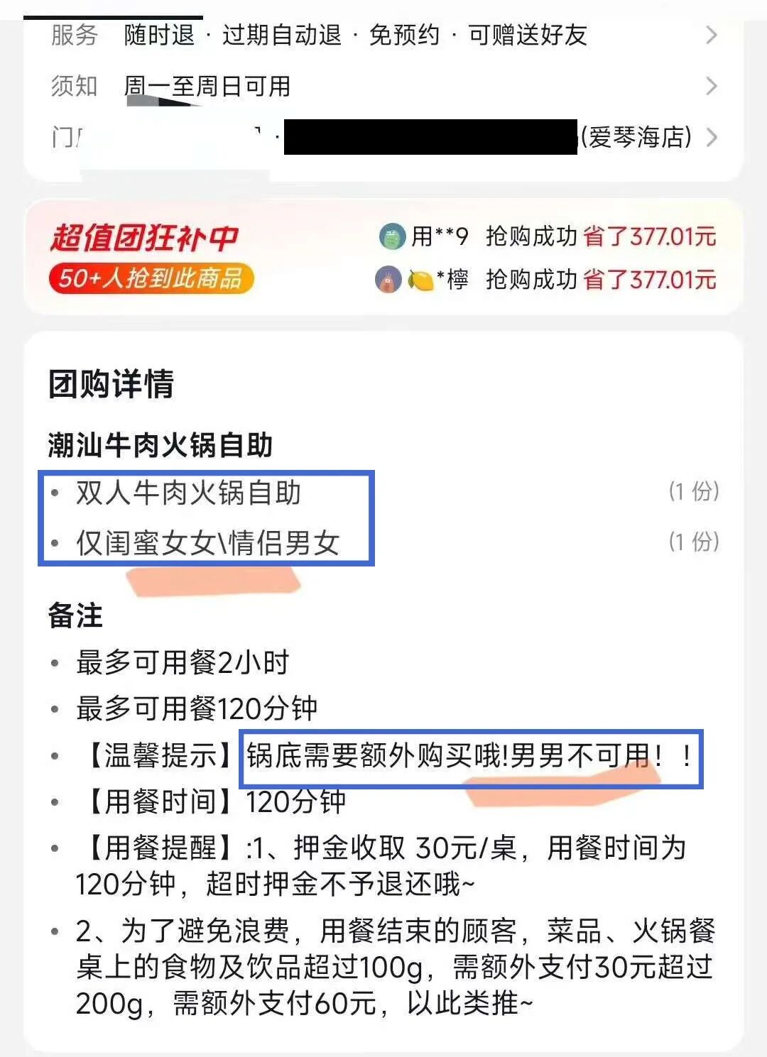 如果用户不认真观看的话,很难发现这份套餐的特殊之处。在套餐的备注中,老板特意提醒,最多可用餐 2 小时,锅底需要额外购买,并郑重提醒:男男不可用!
